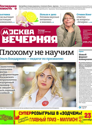 «Вечерняя Москва» — ежедневная российская вечерняя газета, старейшее из вечерних изданий в России, учрежденное в 1923 году. Выходит пять дней в неделю, кроме субботы и воскресенья. Отличается тем, что рассказывает о событиях еще не завершившегося дня. Оперативно освещает хронику и особенности жизни Москвы, охватывает все слои общества и большинство профессиональных и возрастных групп читателей.Издание представлено тремя выпусками – утренним ежедневным, вечерним (выходит три раза в неделю), еженедельным (выходит по четвергам).