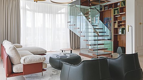 В работу студии Rubleva Design попало необычное, сложное и оттого ещё более интересное пространство, состоящее из двух квартир, расположенных частично друг над другом, в московском ЖК «Покровский Берег». Дополнительным бонусом ко всему этому роскошеству стала небольшая комната на мансардном этаже со скатной крышей и круглыми окнами, добавляющая настроение всему объёму. Отличительная особенность верхнего этажа—высокие потолки и большие витражные окна, в то время как на нижнем уровне потолки стандартного размера. Это обстоятельство обусловило организацию пространства. Дизайнер и её команда сразу приняли решение разделить квартиру по этажам, на две зоны. На нижнем уровне спроектировали приватные помещения—спальни, детские, гостевые комнаты и санузлы. Парадная, общественная часть заняла верхний этаж. ««Эта квартира—идеальное место не только для обычной жизни, но и для карантинной,—улыбается Мария Рублева.—У наших заказчиков есть собственная терраса, она состоит из открытой и закрытой частей, здесь можно приготовить барбекю, встретиться с друзьями и провести время на свежем воздухе. Также мы оборудовали шикарный кабинет, где заказчик может работать из дома и проводить встречи. И, конечно, главное место притяжения всей семьи—игровая–мастерская на мансардном этаже. Это своеобразный клуб по интересам, тут домочадцы занимаются спортом, живописью, играют в настольные игры. Из квартиры вообще можно не выходить на улицу и не чувствовать себя при этом ущемлённо».